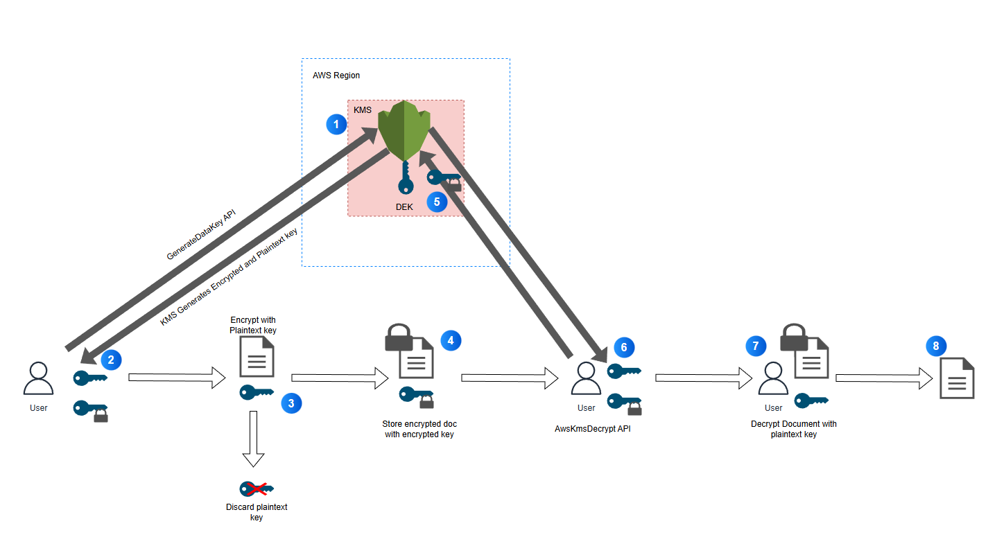 - Can use AWS KMS keys to generate, encrypt and decrypt data keys.